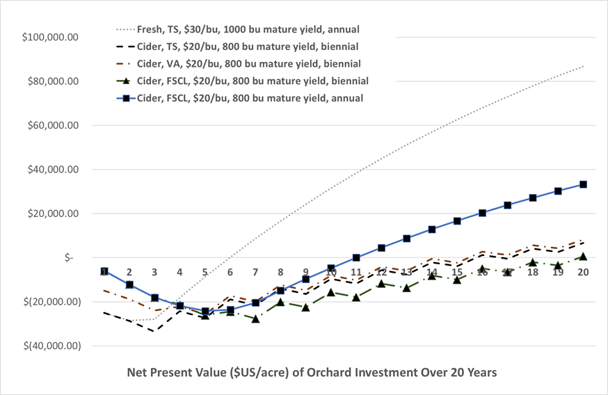 A net present value analysis (NPV) is a common tool used to evaluate long-term performance of a business enterprise like an orchard. Many such analyses have been published by Extension economists in the past 10-15 years. This analysis tabulates costs to plant, manage, and harvest and orchard against returns from harvested fruit and considers the declining value of money over time. These costs and returns vary substantially among producers, and may not be lower for growers of cider apples compared to orchards managed for fresh fruit. Generally, four factors determine the profitability and long-term NPV of an orchard: establishment cost; mature orchard yield; tree precocity, i.e., the time required to attain that mature yield; and fruit price. The shift toward high-density (1000 + trees per acre) orchard systems is based on high yield (1000+ bushels per acre), high precocity (2-3 years to attain yield and full production by years 4-5), good price, and consistent, annual production that offsets the high initial planting cost of these systems.
